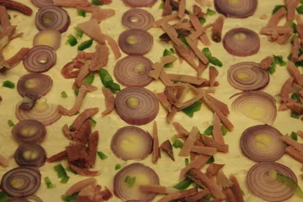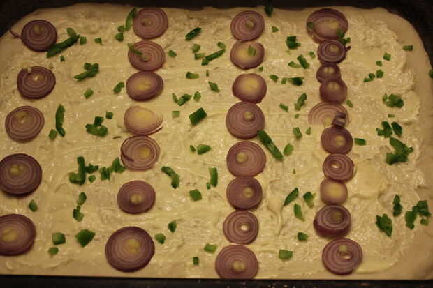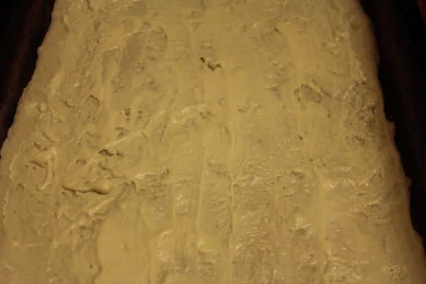 Separó cuidadosamente la crema espesa o nata en la base, si usas crema cruda de la granja gruesa como la mía puede ser bastante difícil de conseguir una capa uniforme. A hacer todo lo posible, como una vez en el horno se funde en la masa.