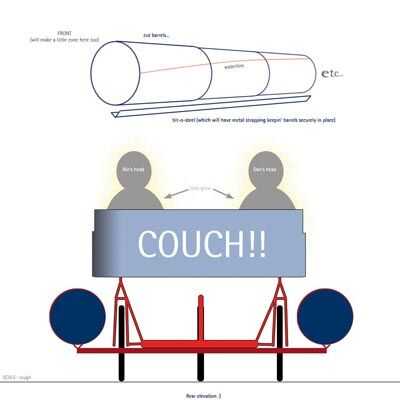 De repente, toda la estructura era totalmente rígida, wow, funciono muy bien!! A continuación hemos perforado un agujero de diámetro 10cm en el lado de los barriles, cerca del final. Así que ya teníamos los mamparos, que fueron rellenados con espuma de poliuretano de expansión. Bombardero.