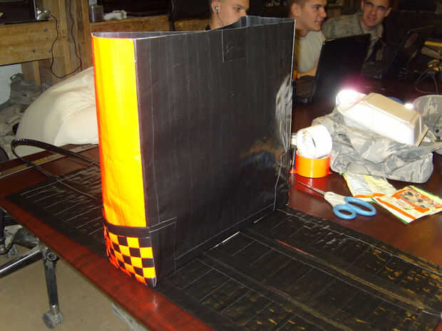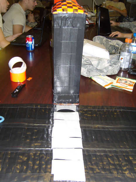 ** Nota: para mantener todo un poco mejor, que rodé tiras largas de cinta hacia atrás sobre sí mismo como hacía cinta de doble cara . Puse unos cuantos a lo largo de la hoja tejida y en el centro donde se sentaría el fondo de la tabla. (Foto 2)