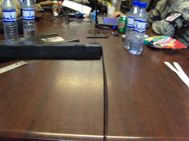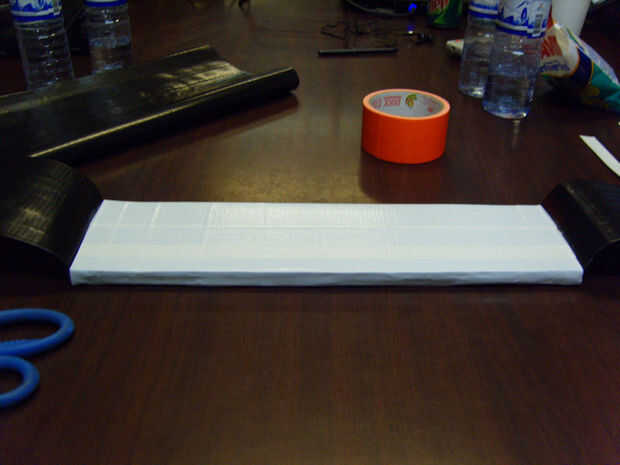 1) vamos a ir con 4" ancho de la hoja 1. Con las tiras de las hojas corre verticalmente (bordes cortados en la parte superior e inferior), alinee el borde inferior al borde inferior de la tabla. Usando una tira larga de 4" de la cinta, coloque sobre el borde inferior de la hoja de la mitad y doble el resto encima de la parte inferior de la tabla. (Foto 2)