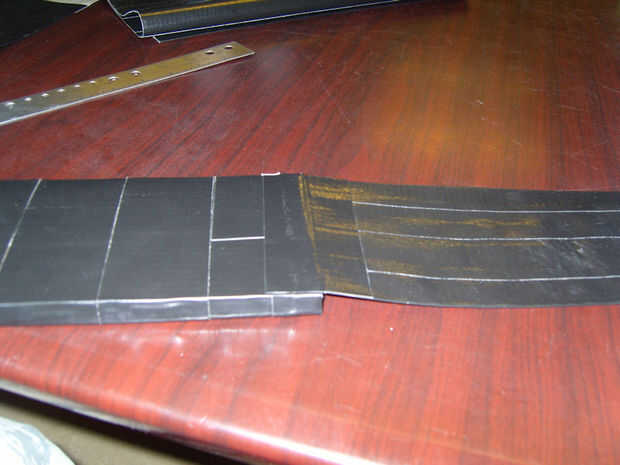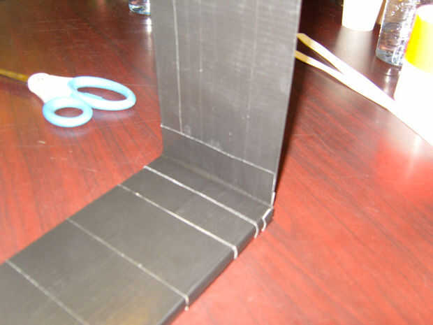 5) utilizando una tira de cinta 15" de largo, hasta la costura de dos hojas en el borde interior. Conseguir la cinta hasta en el pliegue como puedas (su cinta y flexible, curva plana si se puede). Usted notara unos 1/2" de la cinta que se cernían sobre la parte superior de la hoja. Recorte la hoja a ras. (Foto 7)