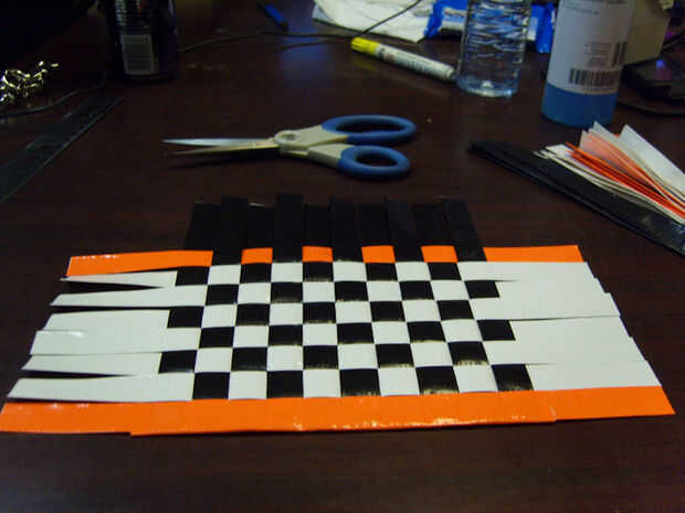 7) cortar una tira de cinta para ir borde a borde de la 1ª a última franja vertical. Coloque el borde de la cinta directamente sobre la fila 1, sellando el tejido tiras juntos. Doblar el resto de la cinta para la parte posterior. Presione firmemente