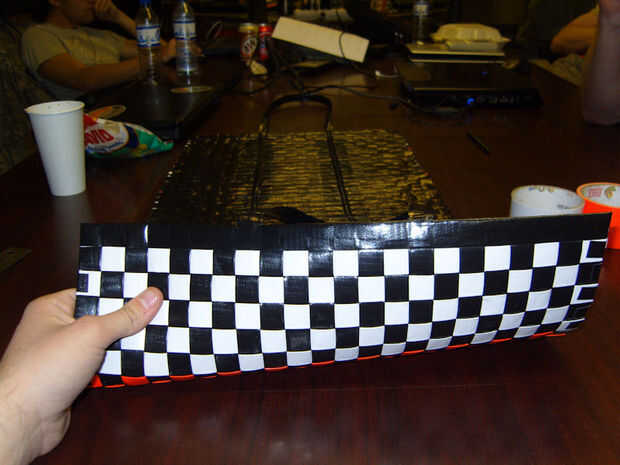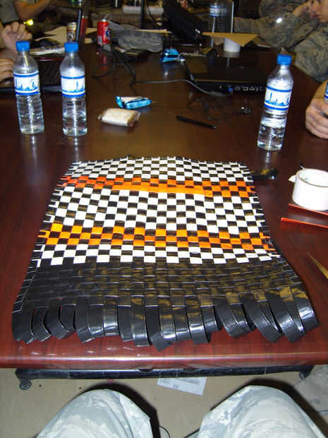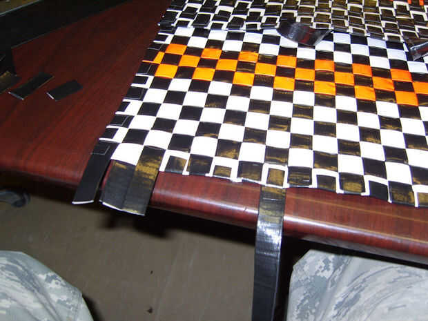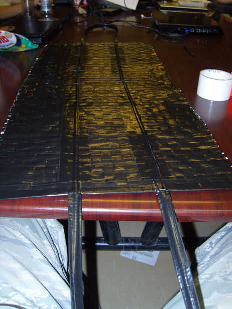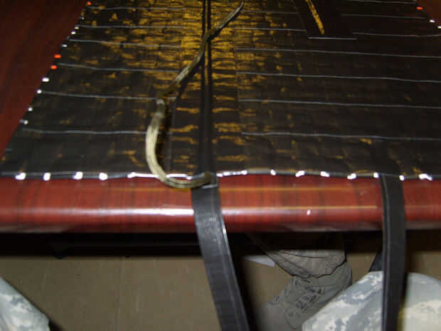 15) poniendo la vaina aprox 1/4 de camino hacia abajo de la longitud de la hoja de tejido (en consonancia con las correas de la empuñadura), cinta de la vaina al borde de la hoja del tejido posterior. (Foto 13)