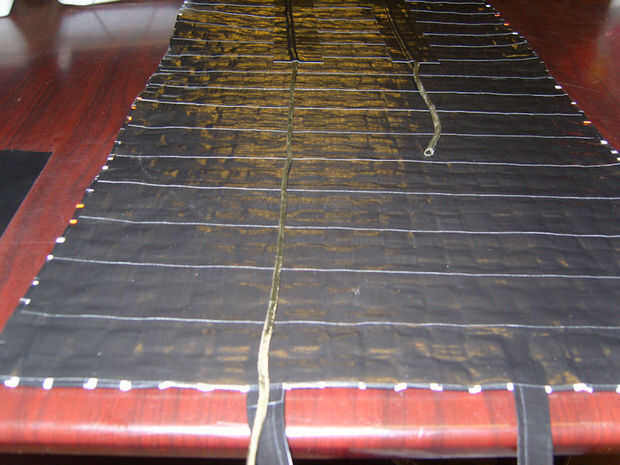 11) con todas las filas finalmente terminadas, debe tener algunos cabos sueltos en los extremos de las tiras de 36". Recorte los extremos al ras de la última fila de la hoja y todos los extremos a la fila final de la tachuela. (Foto 7)
