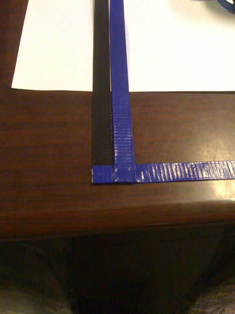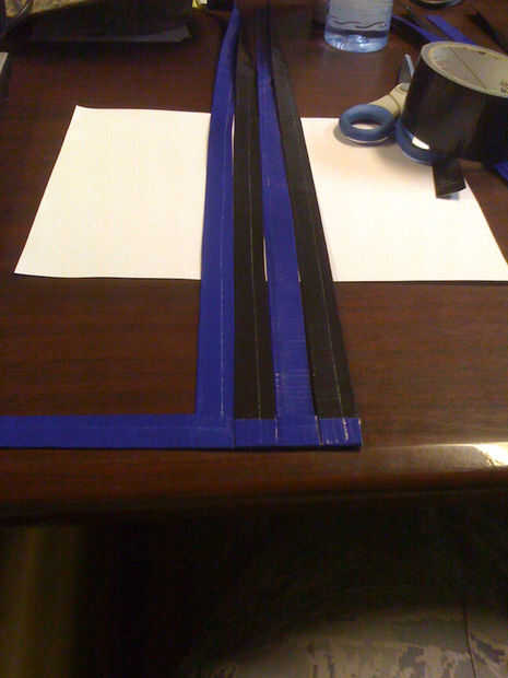 2) agarra su primera 20" tira y colocarlo perpendicular a la 9" y el pliegue sobre el pequeño pedazo de cinta. Voltee las tiras y su 2 º tira al lado del 1 º de la cinta. Asegúrese de que la tira siguiente son el alternarse en ambos lados de la franja de 9". Continuar hasta que todas las 12 tiras alineadas en el borde de la franja de 9". (hacer todo lo posible para mantener las tiras siguientes a 90 grados uno del otro) (Pic 2-4)