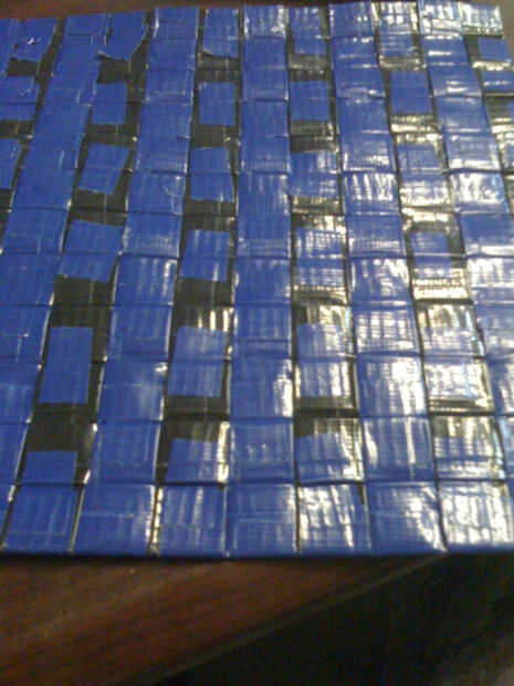 3) pull back cada tira del otro y pegar la siguiente tira de 9" en. Usando los cientos de 1" x. 5" las tiras, virar cada fila de 9" tiras a la fila anterior. Asegúrese de mantener el tejido tan apretado como sea posible sin aplastar para que arruga las tiras donde intersectan. (Foto 6)