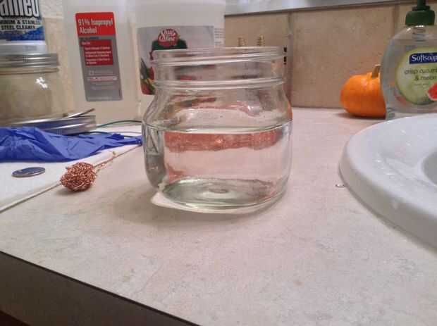 Lo primero que tienes que hacer es agregar partes iguales de vinagre y agua oxigenada en su tarro de masón (es decir "mitad y mitad). Su relación no necesita ser exacta. El peróxido de hidrógeno hará que el cobre al oxidarse rápidamente. Esto, a su vez, permite que el cobre reacciona con el ácido acético en el vinagre rápidamente.