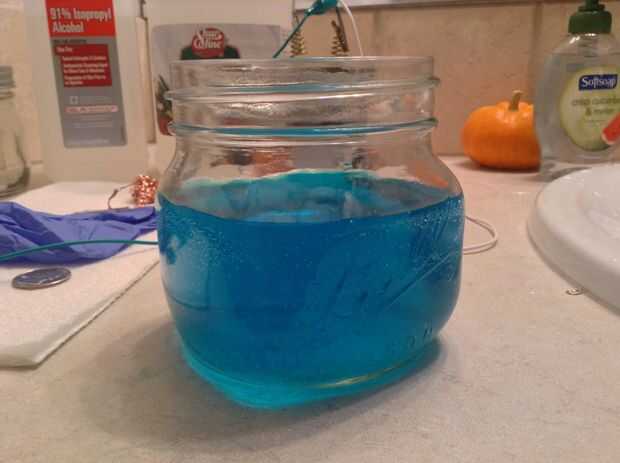 Tenga en cuenta que el objetivo no es crear una solución muy saturada de acetato de cobre. De hecho, es mucho mejor tener una solución más débil que uno fuerte. Cuando empezamos de electrochapado, queremos que el átomos de cobre para crear capas muy uniforme en nuestro objeto. Si el cobre se acumula demasiado rápido, no se adherirán bien y obtendrá puntos de "quemar".