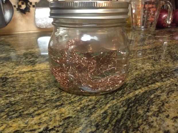 Colocar el cobre en la mezcla caliente de vinagre/peróxido. Enroscar la tapa y agitar suavemente.