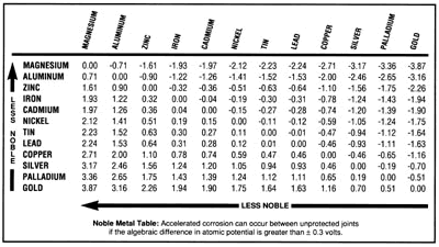 Depende. Ciertos metales jugar bien juntos, otros no. Los que no son llamados "metales disímiles". En la foto, encontrarás una tabla que he tomado prestada de RFI. La mesa está diseñada para hacerle saber cuando una reacción galvánica puede ocurrir causa corrosión. Para nuestros propósitos, también nos dice que los metales son compatibles y cuáles no. Cuanto menor sea la magnitud de número (también conocido como el valor absoluto), el más compatible (es decir similares) serán los metales. Si está tratando un metal que no es compatible la placa, puede que necesite a la placa con el cobre o metal también por primera vez. Usted puede encontrar mi cobrizado instructable aquí: