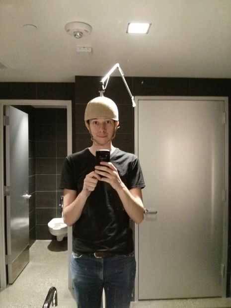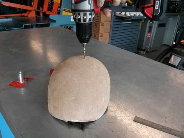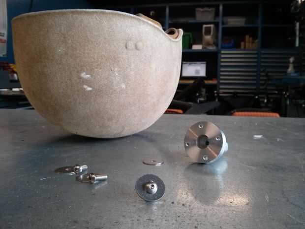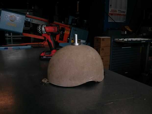 El casco que también encontré en una tienda de segunda mano. Necesitaba una manera de conectar la lámpara de brazo de oscilación que tenía en torno a un trozo de varilla de aluminio para hacer el accesorio. Para que una pieza para torno, no demasiado es terriblemente difícil de hacer. Me aburre un agujero de media pulgada todo el camino a través del centro y reduce el material tanto como pude. Aprovechado en agujeros de 8-32 se para unir el casco con los tornillos y también para un tornillo en el lado.
