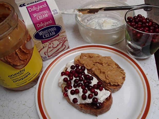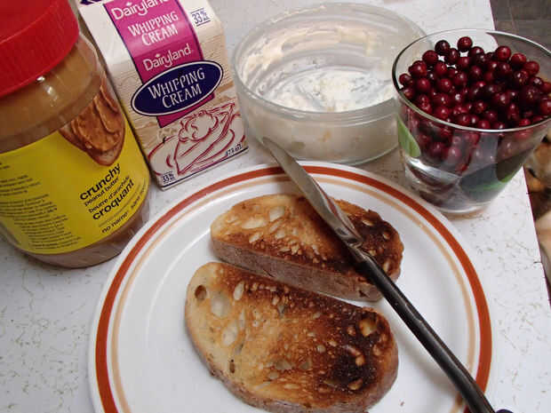 Usted necesitará establecer una base de mantequilla de maní chunky (almendra o nuez de la India) en una rebanada de pan tostado.