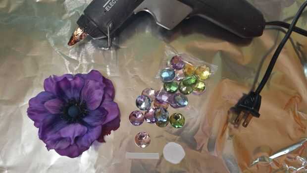Utilizando la hoja de galletas forradas como la superficie de trabajo, precaliente la pistola de pegamento caliente. Con collar de su perro como guía, corte una longitud de elástico que es ligeramente menor en la circunferencia del collar. A continuación, corte un círculo de fieltro lo suficientemente grande como para sujetar a la parte posterior de la flor, pero lo suficientemente pequeño para que no se vean.