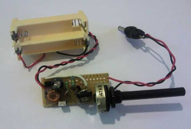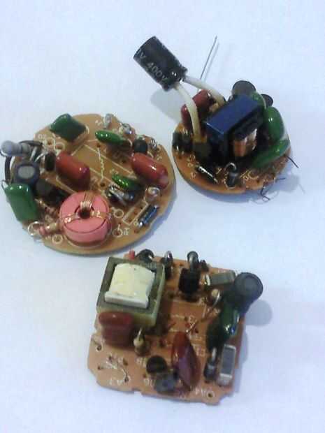 Para probar mi solución, en primer lugar, necesitaba construir el estándar de trabajo a Joule thief. Cómo hacerlo - hay un montón de artículos y sitios de internet (por ejemplo este). ¿Cómo encontrar las piezas necesarias? -Sabía que dentro de la eficacia alta bombillas son algunas partes, que pueden ser usados de nuevo. Tenía una bombilla de defecto y corte con cuidado la caja de plástico. De allí extraje la tensión de la Junta de conversión. En estos PCB pueden encontrarse algunas cosas muy útiles: HV diodos, bobinas, condensadores de alto voltaje, transistores de alto voltaje... etc. (HV significa alto voltaje ~ 400V). Tomé el transformador toroidal de ferrita, cortar y retirar a todos sus cables. Después de desmontado el cebador. Tomé alambre esmaltado de alrededor un metro de él y aliento en el grano de la ferrita. Porque el hilo era doble, yo aliento simultáneamente dos bobinas teniendo ~ 50 vueltas. La mayor parte de la lista de Joule thief (el transformador), el trabajo restante no es tener mucho... Es solamente difícil en el diseño para conectar ambas bobinas en la forma correcta. (ver el enlace mencionado para obtener más información). Diseñados de modo el Joule thief fue capaz de producir 34 V tensión medido en el nodo de colector del transistor NPN (2N2222) sin ninguna carga, cuando se suministra por 1.2V batería AAA (filtro con 2.2uF condensador).