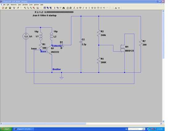 Hay una manera de aumentar la eficiencia de la versión de disparador de Schmitt. Se puede usar cuando se necesitará mayor potencia, lo que significa que la resistencia de base será relativamente pequeña y la DC actual que fluye de la fuente al nodo de tierra a través de esta resistencia y el interruptor NMOS durante la fase activa no podría ser alta. La solución es romper la trayectoria de la corriente por el uso de interruptor PMOS adicional colocado en serie con el resistor de base, con la fuente conectada a la fuente de desagüe conectado al terminal superior de la inductancia L1 y puerta conectado a la salida del disparador Schmitt. Así: Cuando la base de lo BJT es puesto a tierra por el NMOS interruptor, el interruptor PMOS estará abierto y ninguna corriente continua le pas a través de Cuando la salida del disparador Schmitt tiene estado lógico bajo el PMOS se cerrará y conectará la terminal inferior de la inductancia L1 a la fuente de suministro, lo que corresponde a la fase activa de trabajo. Para poder utilizar tensiones de alimentación pequeño (< 1, 5V) en este caso el PMOS interruptor debe él lo elegido, que tiene bajo Ron (resistencia "ON" del interruptor) y baja Vth (voltaje de umbral). Normalmente los dispositivos DMOS satisfacen estos requisitos. Podría utilizarse también JFET transistor. En este caso el resistor de base podría incluso omitir.