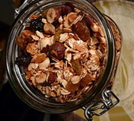 Combinar la fruta, frutos secos y granola en un tazón grande. Para almacenar mezcla de rastro, coloque en un recipiente de vidrio hermético. Mantenga el envase en un lugar fresco y seco durante 1 mes. Por supuesto debe sentirse libre de modificar a sus necesidades y gustos.