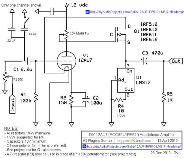 -El circuito es simple. Utiliza sola doble triodo tubo. Esto permite que el circuito amplificar ambos canales (izquierdos y derecho) con un tubo. También se usa MOSFETs como los seguidores de los tubos. Seguidores de tubo requieren el uso de un transformador de salida-esto muerde gravemente a la eficiencia y el tamaño del circuito (y hace más costoso)