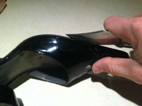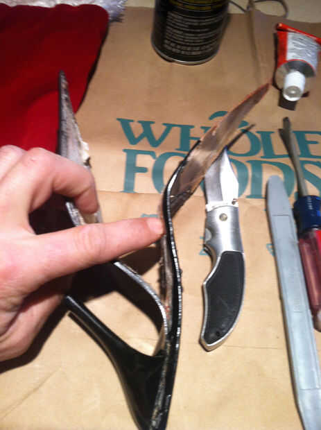 Separar la parte superior de la suela del zapato. Inserte la hoja del cuchillo entre la suela y roca hacia atrás y de cuarto. El dedo del pie es un buen punto para comenzar. Me enteré después de tomar la fotografía y luchando. Usted tendrá que abrir el talón arriba también utilice el cuchillo para abrirlo y sacar el material superior. Utilice un destornillador recto para levantar los bordes de la suela del talón plástico. Cuando termines el zapato debería verse como la segunda foto.