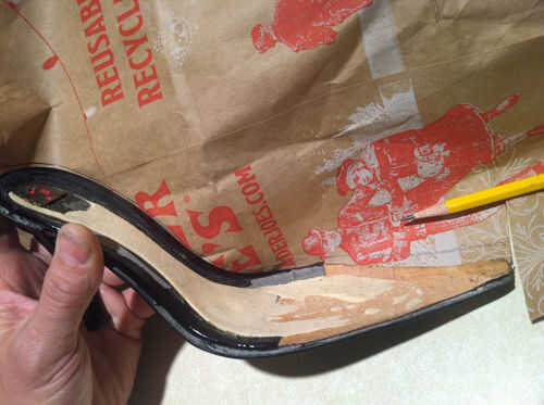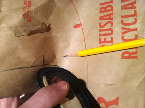 Ahora toma tu bolsa de papel y corte los paneles delanteros y traseros. Coloque la bolsa contra el zapato y trazar la planta del pie a la bolsa. Usted tendrá que marcar el punto central del talón y del dedo del pie. No pero (lo hizo en el dedo del pie y tuvo que cinta adhesiva)
