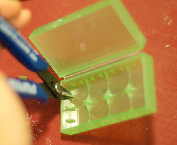 Paso 2: Perfore un pequeño agujero encima de cada punto donde usted lejos recorta el plástico. Taladro alto como sea posible para que sus terminales de soporte de la batería sea cerca del centro de la batería.