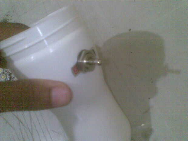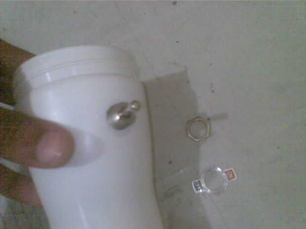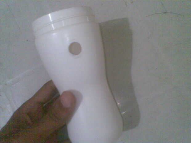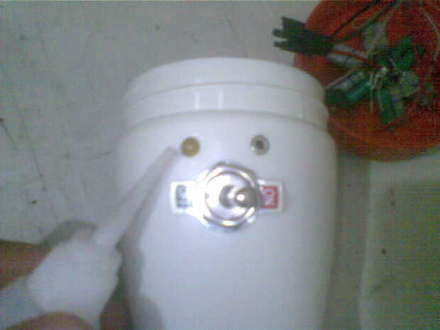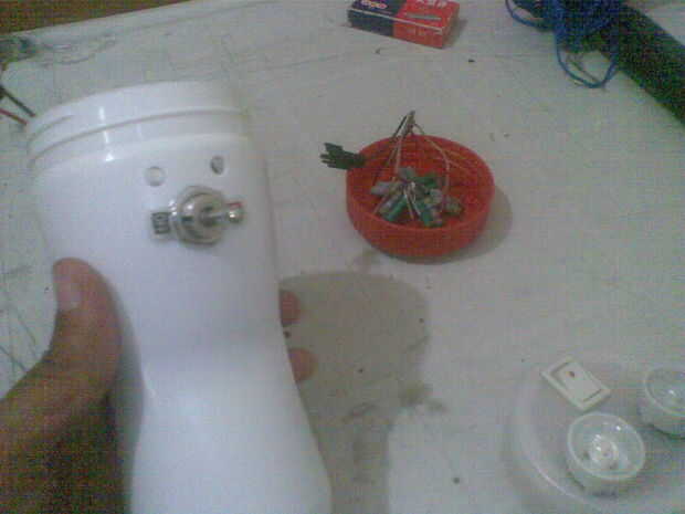 Con la posición del eje así definido, el cableado apenas cabrían en la parte superior. Para ajustar el interruptor interior baja bastante tuve que tallar lejos algunas de plástico con una lijadora. Usar pegamento para agregar LED y convertidor, y luego la botella se forma algo como un juguete divertido.