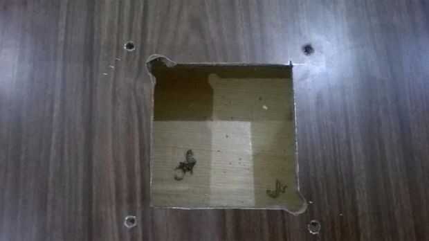 Bueno, puede seguir adelante y montarlo con tornillos y tuercas, pero usando hilos elimina mucha de la vibración desde el cojín de enfriamiento. Con hilos, crea una red suspendida que no se propaga la vibración tanto como sería un contacto real. Por lo que debe utilizar estas suspensiones. Hacer cuatro pequeños agujeros con las uñas fuera de cada esquina del hoyo.