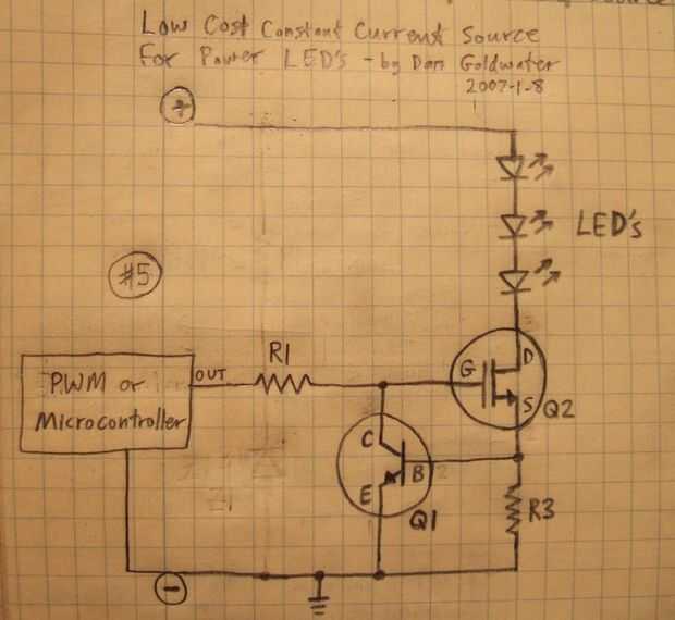 "El flujo de corriente principal es a través del LED, a través de Q2 y a través de R3. Cuando demasiada corriente fluye a través de R3, Q1 se empiezan a encender, que empieza a apagar Q2. Apagar Q2 reduce la corriente a través del LED y R3. Así que hemos creado un "circuito de retroalimentación", que continuamente monitorea el corriente del LED y lo mantiene exactamente en el punto en todo momento. los transistores son listos, EH!" Fuente: