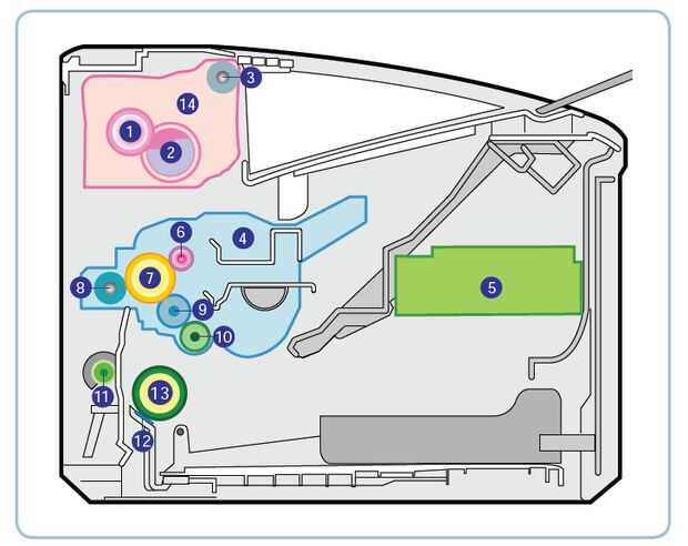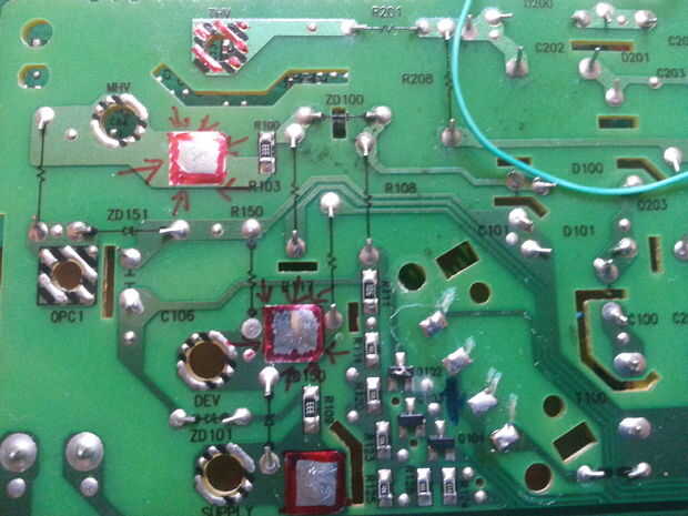 En este tablero de la fuente de alimentación, las salidas están claramente identificadas como DEV, MHV, abastecimiento y THV. Si lo tuyo no tiene tal etiquetado, intentar averiguar donde se encuentra la etapa de "desarrollo" de la impresora, entonces encontrar cualquier alambres o contactos metálicos que están tocando la fuente de alimentación. El contacto de tierra de alta tensión debe buscar el mismo (situado generalmente en la periferia de la envolvente del tablero todo).