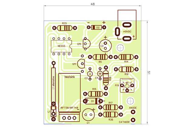 El pcb ha sido obtenido en DipTrace de mi esquema. Tal vez usted puede diseñar un mejor arreglo de los componentes, no al ácido este tablero ya incorporo el circuito de alimentación en mi tablero de reloj nixie. Hay espacio para un disipador de calor grande, también si probablemente no lo necesitas. En alternativa puede establecer el mosfet. A la izquierda puede ver la forma larga de la alternativa de inductancia. En la parte inferior derecha encontrará los contactos del ánodo y el cátodo, donde conectar la pantalla.