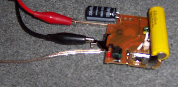 Para activar el flash, conectas los dos accesorios metal forma irregular en el lado de la tabla donde se muestran los cocodrilos. Una vez que han destripado la electrónica de la cámara es divertido probar poniendo una batería y poner en cortocircuito las dos piezas metálicas con un destornillador o un poco de alambre, ser muy cuidadoso de los altos voltajes involucrados.
