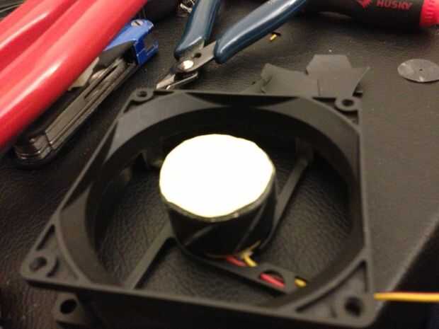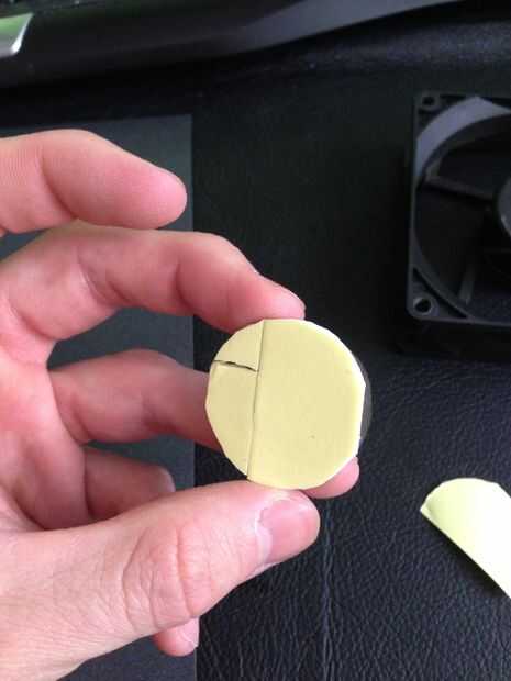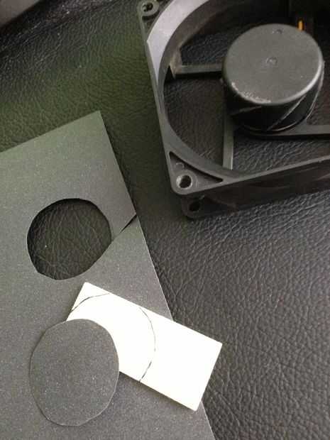 I hapend tiene un papel de lija, así que corte un círculo del diámetro correcto del ventilador, cinta de montaje, tiene dos caras adhesivas, corta del diámetro adecuado en que y pegadas al ventilador usando eso))