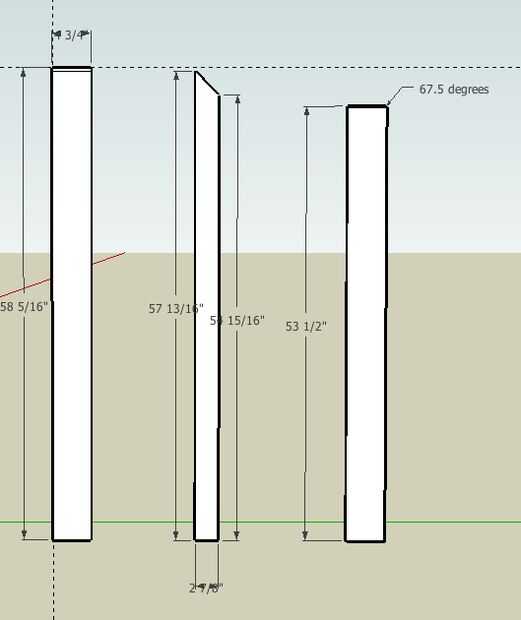 4 piezas laterales - con un corte de 45 grados a un lado. Un lado de la madera será 54 15/16" de largo y el otro será 57 13/16"