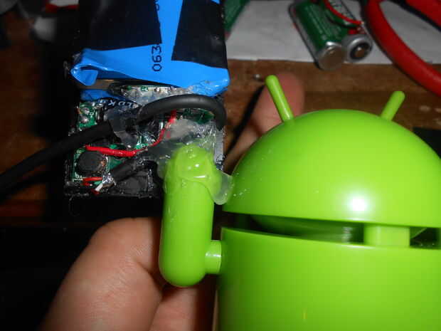 Así que por ahora ha probablemente encontrado que solo estamos tomando un teléfono solar cargador haciendo lo suficientemente pequeña para caber bien en el droide. Todo lo que haces después de tener el circuito en la parte posterior del panel es el panel solar en el brazo adroids del pegamento, usaría algún gel de pegamento decente para esto. pegamento caliente tiende a derretir si su exposición al sol por un tiempo. También pegué su brazo para que no se mueva por el peso del panel. Asegúrese de que el cable es suficientemente largo para alcanzar el puerto del usb del altavoz. Después el gel super fija se realizan con la parte más difícil. Hasta el momento su estado muy facil :)