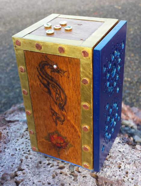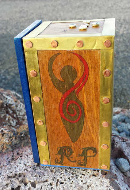 Solía tinta para madera aceite danés en los laterales y tiras de la izquierda sobre láminas de latón adornan los lados. Utiliza pegamento para montar la chapa de latón continuación, había usado clavos de cobre para la decoración y la mejor celebración de las tiras de latón. Una vez que la mancha tenía tiempo suficiente para seque a fondo utilizó el método encontrado aquí para agregar imágenes a la superficie de madera. Me las imágenes en Photoshop y les imprime en mi impresora de láser de obras. Utilicé un spray capa transparente para proteger las imágenes una vez que se completó el proceso.