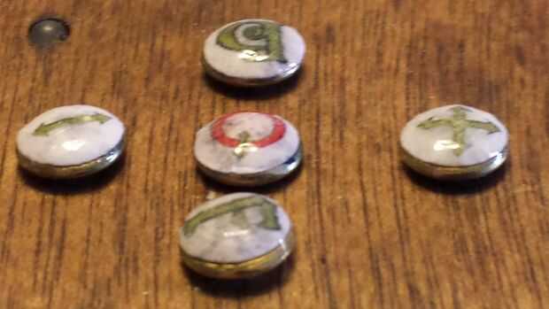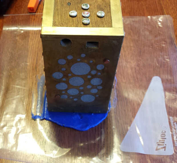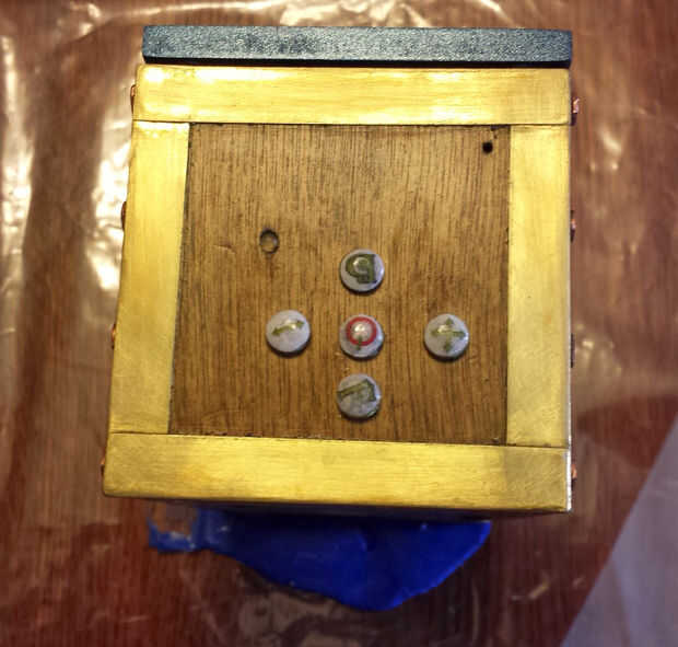 Los botones eran aproximadamente 1/4" ancho que pasó a ser el mismo tamaño que el agujero dejado por un sacador de agujero estándar. He creado imágenes en Photoshop y perfora hacia fuera. Usé esmalte de uñas de dedo claro y enlazar las imágenes a la parte superior de los botones del remache (ligeramente lijado ayuda a mantener el poder). Podría utilizar un acrílico símbolos a pintura en los botones. ¿Recuerdas mi mess up de antes? Aquí es donde me picó en la culata, tuve que averiguar lo que los símbolos a utilizar para los botones atrás y adelante como los triángulos dobles estándar no funciona los botones de rotación que causa confusión. En su lugar utilicé un B una F para ellos rociaron algunos capa transparente en la parte superior para que la madera correspondería con los lados y Unido más de la chapa de latón.