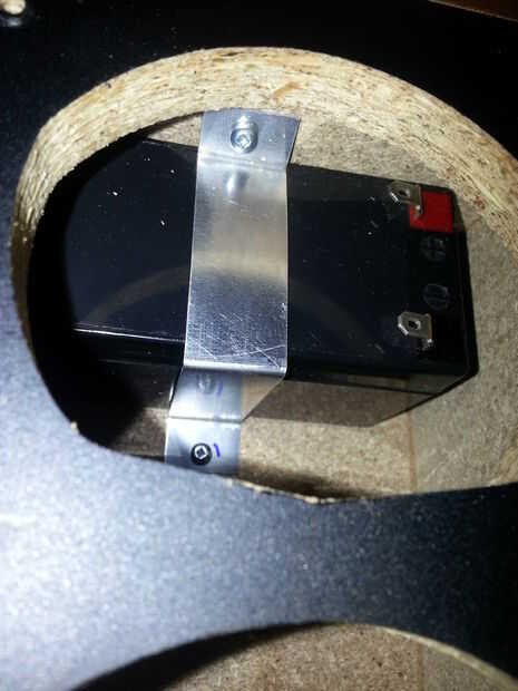 En primer lugar, poner la batería en su lugar. Utilicé tornillos para madera #4 para el montaje de todo, y perforados 5/64ths piloto agujeros siempre que sea posible. Si no es posible agujeros piloto está bien ya que el tablero de partícula puede tomar un pequeño tornillo sin agrietarse.