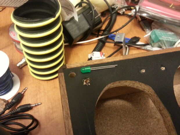 Ruta del LED para arriba a través de un agujero en la cara del altavoz del gabinete y asegure con el soporte de LED. Sólo tiró de uno de los soportes de la pantalla de polvo hacia fuera con unas pinzas y ponerla allí.