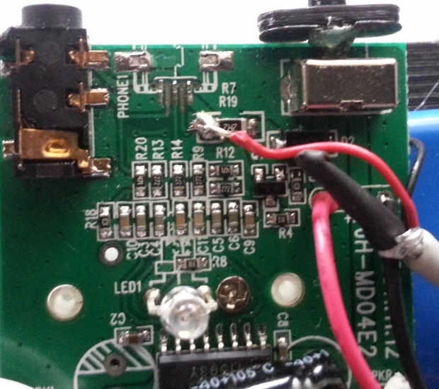 Elegí esta última puesto que de esa manera que siempre puedo cargarlo mientras tenía energía del usb a la mano. Ahora ya que yo no pude soldar sobre la clavija usb original debido a que siendo rasgado para arriba, mi primer paso era trazar la línea de USB + para ver donde condujo con medidor de continuidad en mi multimetro. Fue conectada a la primera resistencia creo que se denomina R7. Esto era buena causa entonces podría el cable positivo directamente a la resistencia de la soldadura y ojalá conseguir un vínculo fuerte y robusto que duraría.