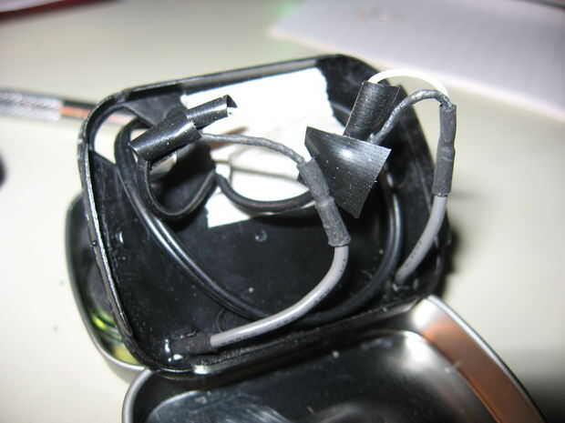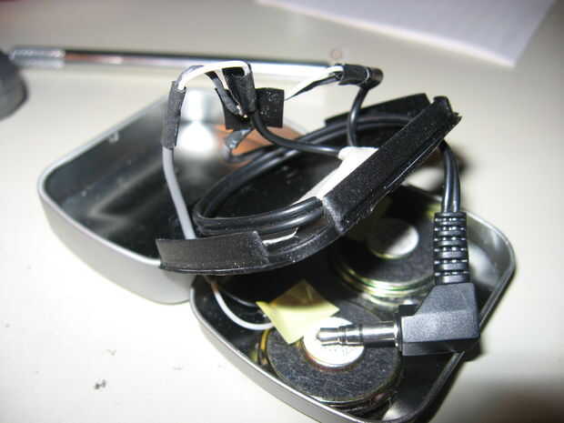 Este paso es bastante fácil, simplemente pase todos tres cables por los agujeros en el plástico o cinta de pegamento les a la lata si no tienes una tapa de plástico. Y los 2-4 puntos de soldadura. Genéricas jacks estéreos de auriculares tienen dos cables y dos más en cada uno. (Yo no soy mucho de un chico inteligente electrónico así que voy a dejar que otras personas me corrija aquí) El cable interno no aislado es la tierra y el aislamiento es la alimentación uno. He encontrado que no importa que uno va donde el simple altavoces (por pruebas de conexiones normales y reversas) soldadura tan lejos.