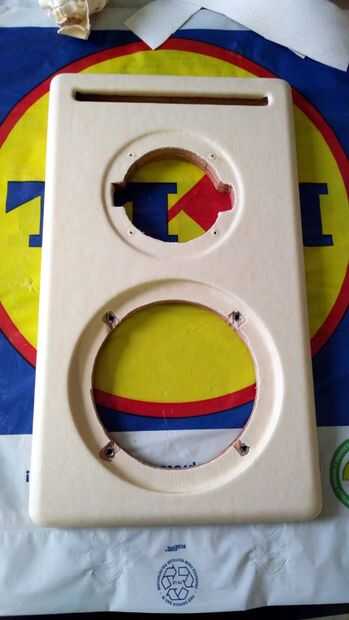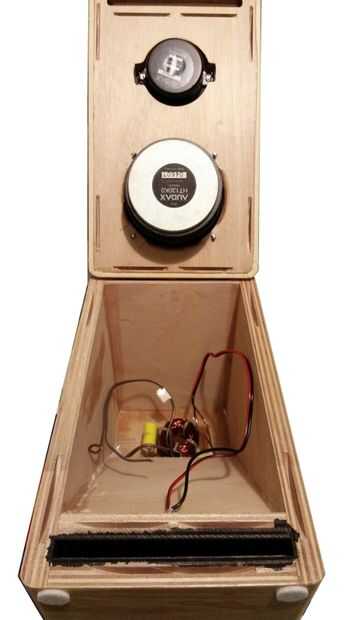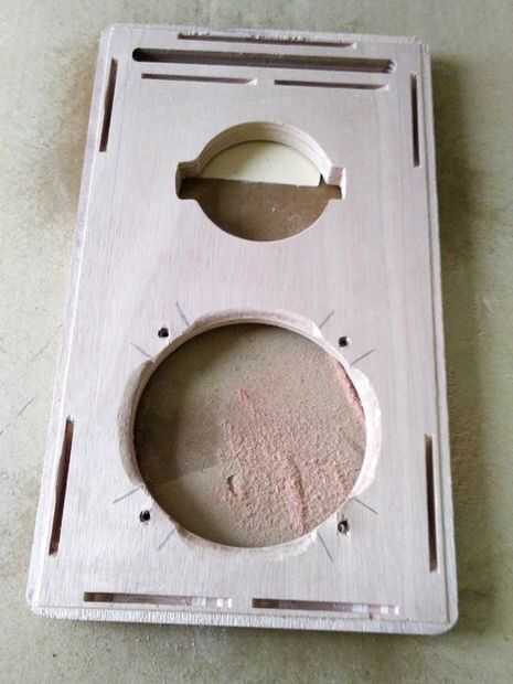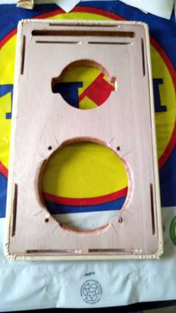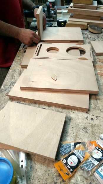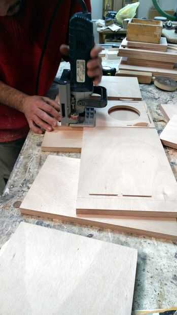 Primero cortar todas las piezas gabinete. Marcar y abrir los orificios para los controladores mediante una sierra de vaivén o el cortador del agujero del círculo. Luego, con la ayuda de un router de corte el diámetro exterior de los altavoces para sentarse cara a cara con la madera contrachapada. Una vez más, utilizar el router para redondear los bordes gabinete de los paneles delanteros y traseros.