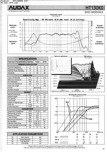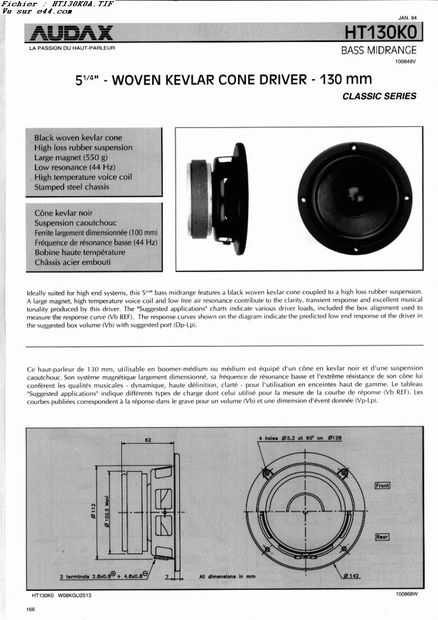 El HT130K0 es un 8 Ohm tejido Kevlar 130mm o 5 1/4 pulgada cono conductor clasificado 40 WATS con frecuencia de resonancia (Fs) a 44 Hz y todo lo que a sensibilidad de 90 dB, que es un gran piloto para un altavoz de estantería pequeña.