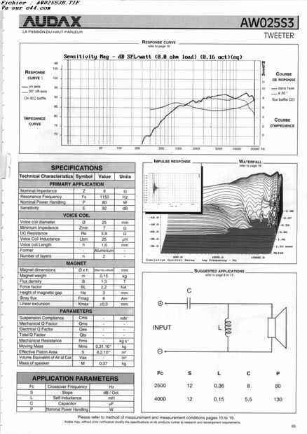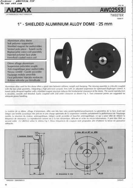 La AW025S3 es una aleación de aluminio de 8 Ohm apantallado 25mm o controlador de domo de 1 pulgada nominal 80 WATS con frecuencia de resonancia (Fs) a 1150 Hz y todo lo que a sensibilidad de 92 dB.