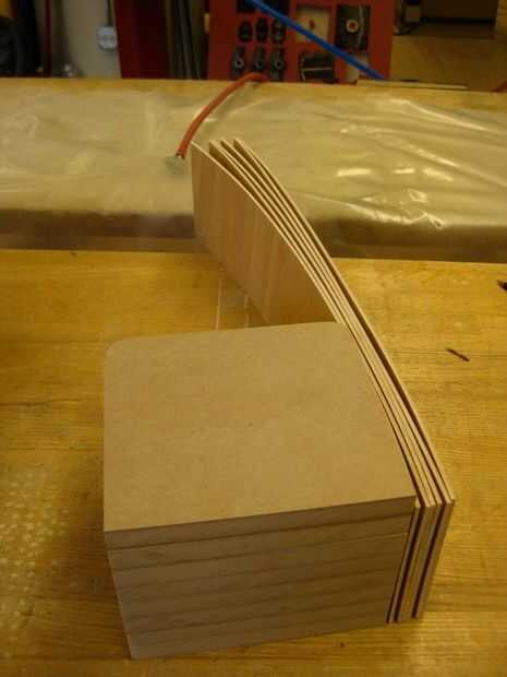 Entonces comenzó a apilar piezas de mdf y había hecho un bloque, que era aproximadamente tan grueso como el plegado de capas era amplia. Me pegan la pila y di un radio a cada esquina que sería el flexión de capas en contacto. Con ello de que nos aseguramos que la flexión no demasiado lejos de la curva y ajustar. También ser generosa con su radio, mina eran un poco pequeña para que la forma final estaba un poco más alterada que quería.