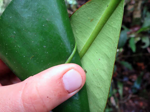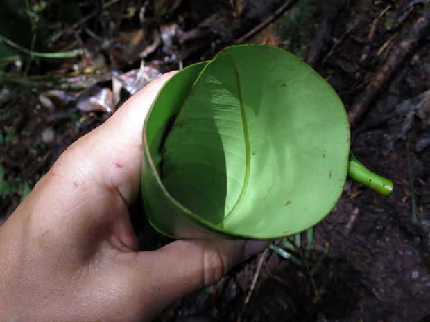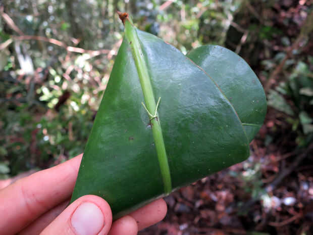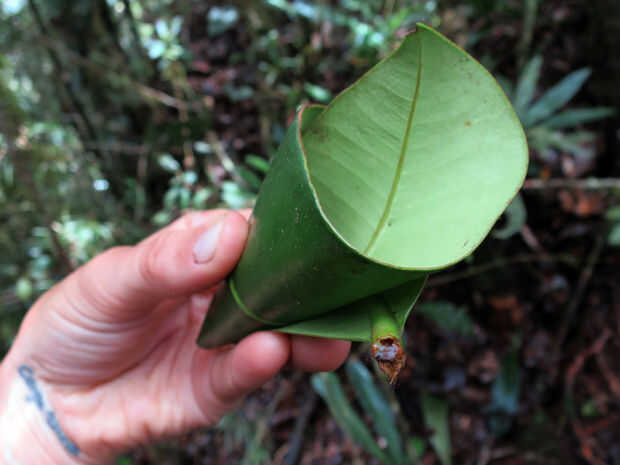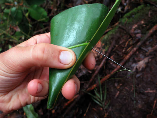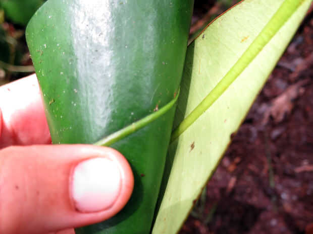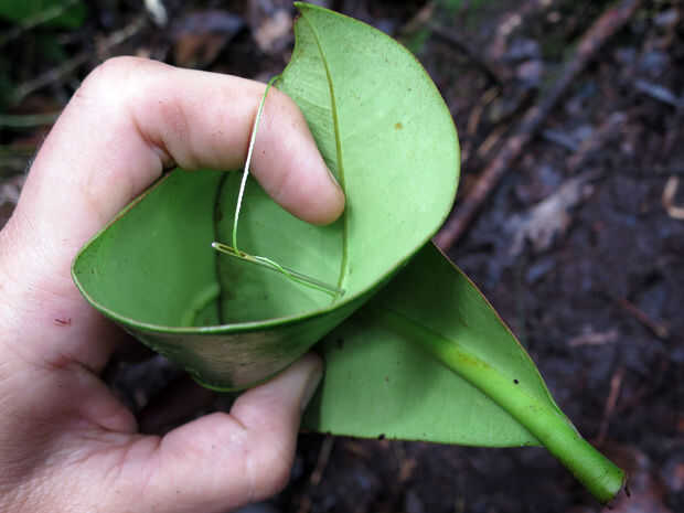 La hoja es enrollada en forma de cono y luego se sutura en el lugar con una sola puntada. Rodillo de la hoja en un cono y buscar el lugar donde el tallo/vano principal de la hoja se traslapen como se muestra en las fotos. Costura a cada lado del madre/vano permitirá sacar la puntada apretada sin el corte del hilo de rosca a través del material de la hoja. Es importante que este punto va y a los costados de la hoja principal vástago/artary ya que esta arteria es robusta para detener el hilo de rasgado, coser en cualquier otro lugar de la hoja hará que la fuerza de la hoja en espiral lentamente Hale el hilo y corta el material de la hoja. Después de coser, estire la fibra de hilo y atar dos nudos en ella.