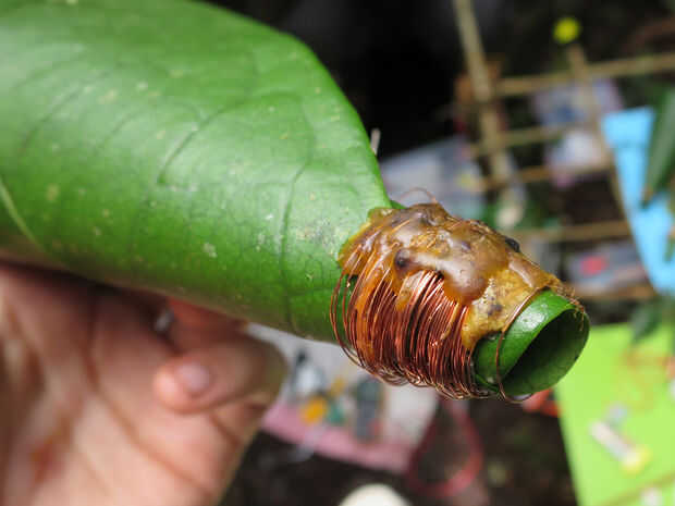 Cera de abejas es agradable porque huele tan bueno, pero realmente se puede utilizar cera de vela para esto. Calentar la cera en un continuador usando un encendedor o incluso encendiendo una vela y utilizando su llama. Sostenga la bobina en lugar mientras que gotea la cera sobre ella y asegurándose de obtener en la hoja, así. Se puede volver con mechero para calentar la cera en la bobina para alisar hacia fuera y se dispersan más.