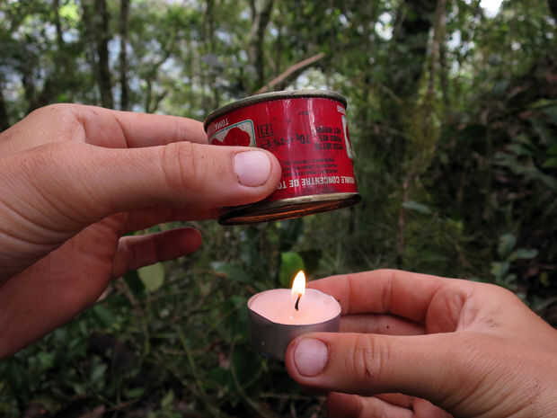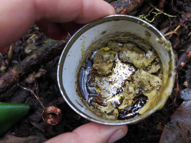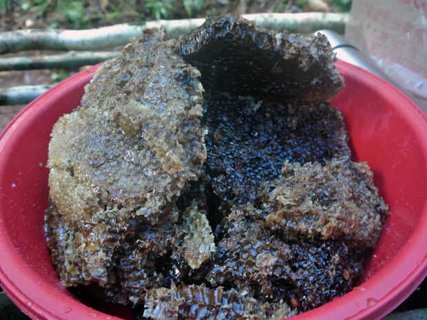 Tuvimos suerte que el día antes nuestros guías había salido en busca de una ruta por la montaña a nuestro siguiente campamento y había regresado con bolsas con miel y de nido de abeja. Por supuesto nuestro primer pensamiento fue comer tanta miel como pudimos - un cambio de la dieta de arroz y carne. Pero la cera se convirtió pronto en parte de nuestra colección de materiales de laboratorio de la selva. Aquí hay un video muy bonito que Andy editado juntos sobre el origen de la cera de abejas que solía hacer los Spekers de selva: