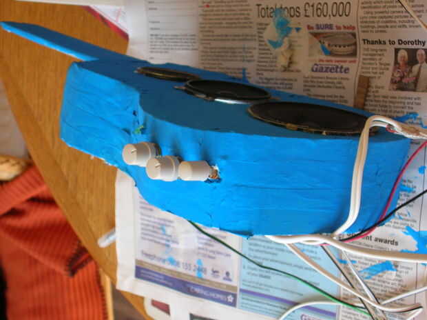 Realice los orificios para los nobs, botones y LEDs. Pero no pega en todo como usted no podrá conseguir altavoces.