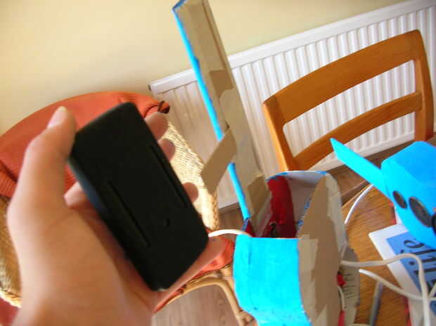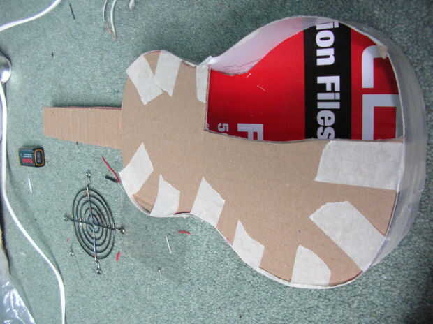 Se ha añadido un simple pedacito de cartón en el cuello para sostener mi reproductor de mp3 ya que tiene una caja que se desliza sobre la cartulina.