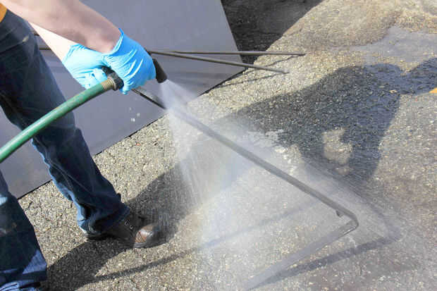 Aerosol de sus piezas metálicas con una manguera para lavar la mezcla gunmetal. Dejar las piezas secar completamente antes de proceder. No te preocupes si empiezan a desvanecerse y a su vez funky colores. Es una parte normal del proceso.