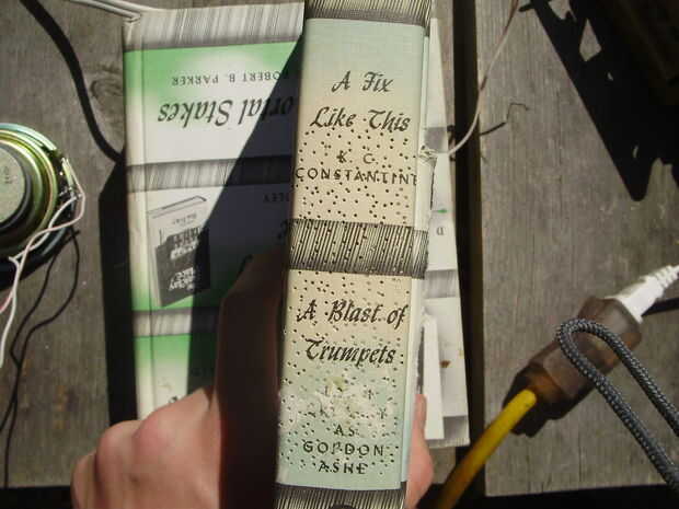 Existe una capa intacta de cartón fino entre el altavoz y el exterior. Con un alfiler, o algo similar, meter un montón de agujeros en la columna de los libros.